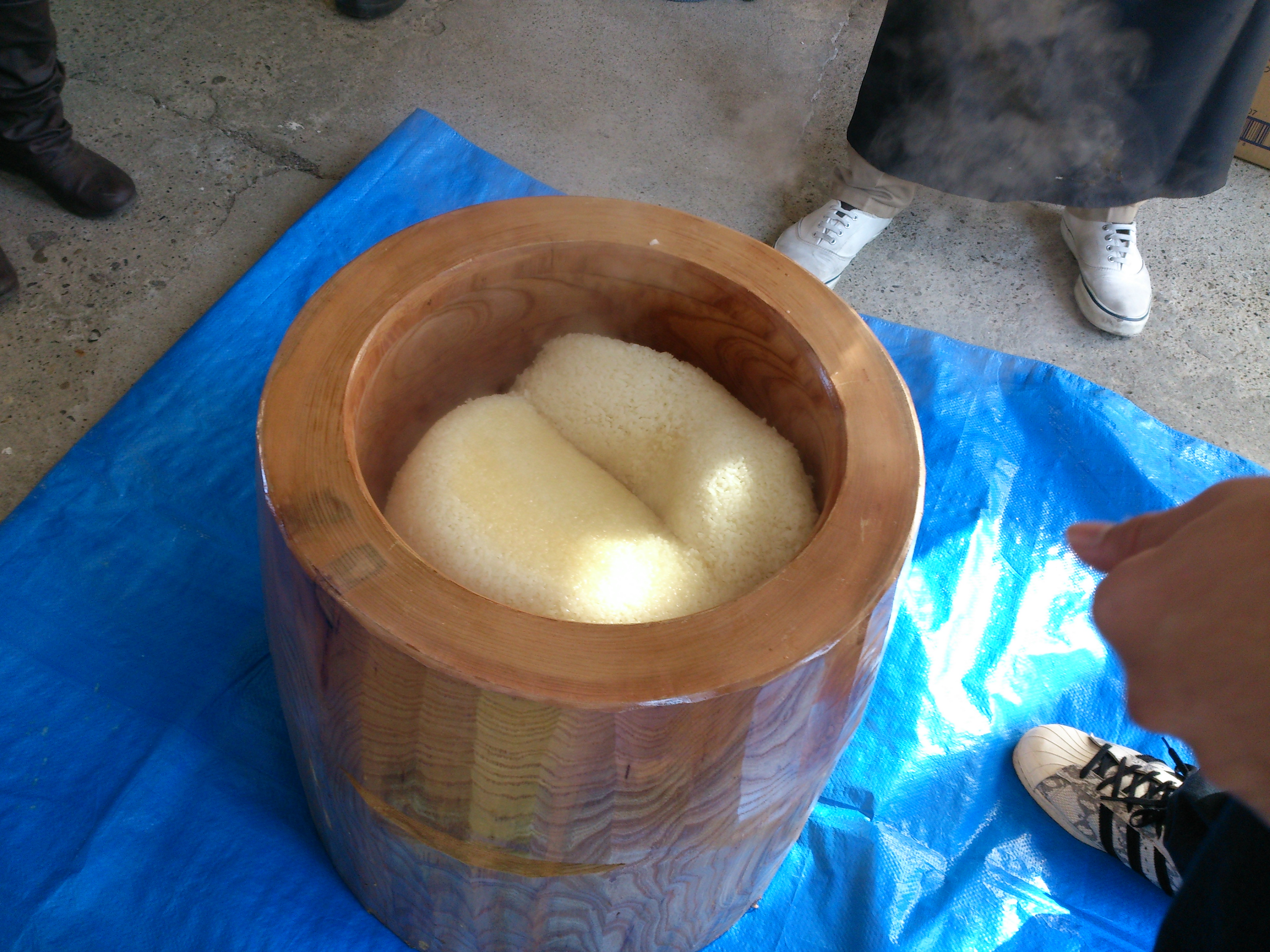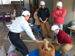 はい!餅米が見事に臼に着地しました☆しかし、この状態から餅になるまでがこれまた一苦労。。。杵で餅米を潰すように臼の周りを回りながらこねていきます。