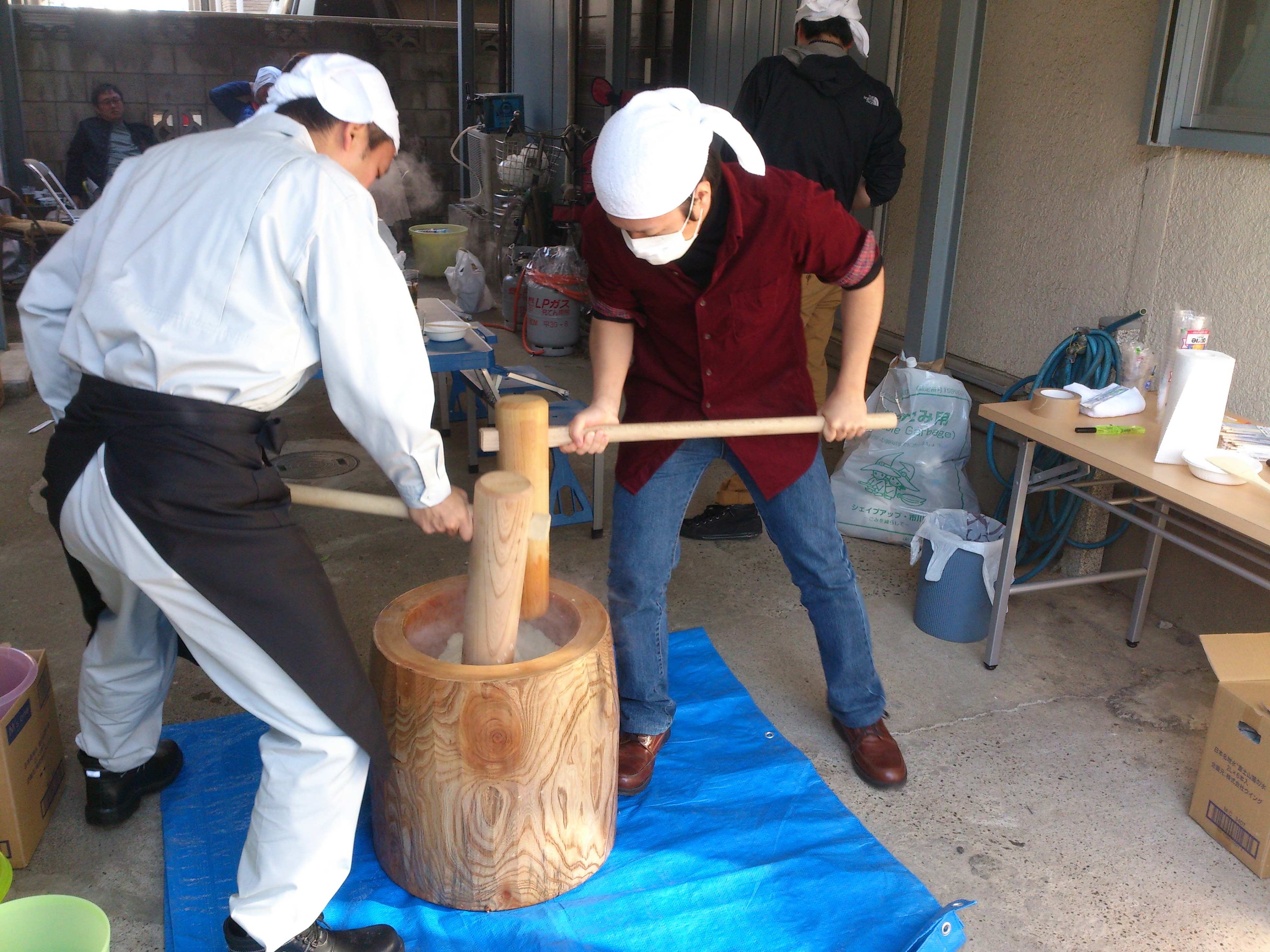 昨年の同じ時期に比べれると慣れたものです。みんな手際よく準備し、餅米を蒸して準備しています。いつでもペッタンペッタンできる状態です。杵を持つ格好も様になっています!!